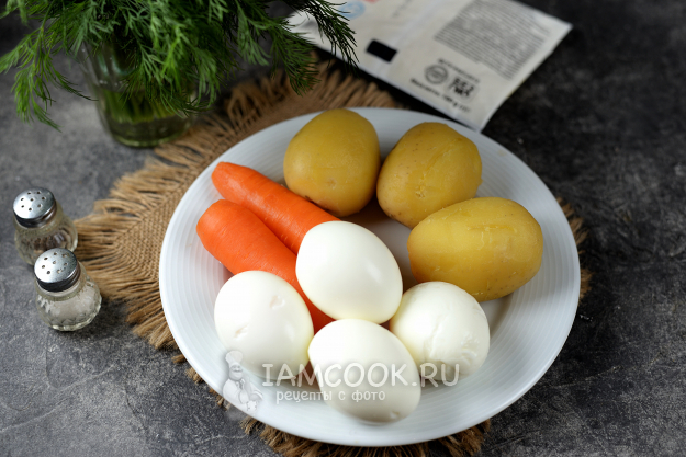 Остывшие овощи и яйца остудите и очистите от кожуры и скорлупы. Отложите в сторону половину моркови и одно яйцо.