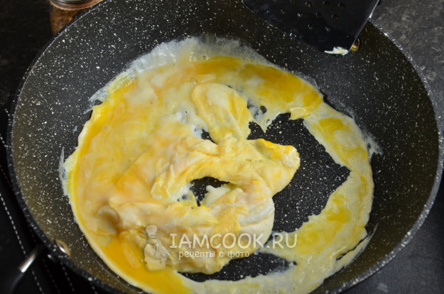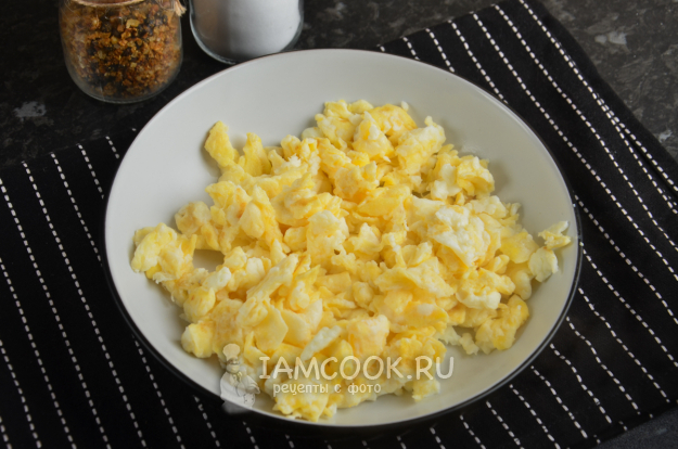 Сковороду смажьте растительным маслом и разогрейте. Перелейте яичную массу и жарьте, помешивая лопаткой. По такому принципу готовится скрамбл.