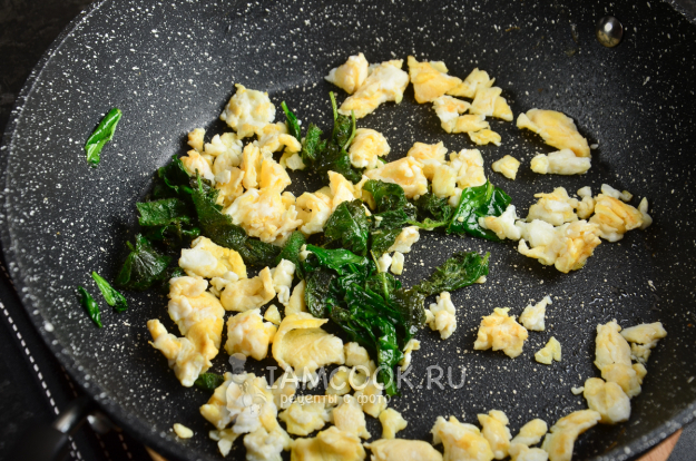 Переложите в сковороду скрамбл, все перемешайте и держите на сковороде еще пару минут.