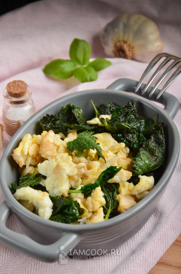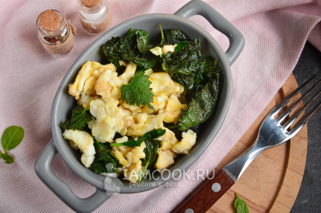 На стол жареную крапиву с яйцом подавайте сразу, в горячем виде.