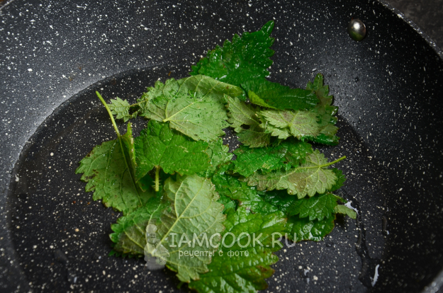 Листья крапивы отделите от стебля, помойте и обсушите. Уберите чеснок из сковороды и переложите сюда же листья. Обжаривайте, помешивая, минуты 3-4.