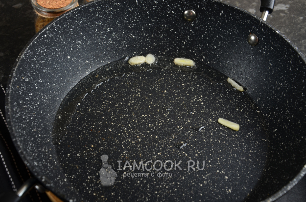 На сковороду налейте немного масла и разогрейте. Зубчик чеснока почистите и нарежьте пластинками, выложите в масло и жарьте на тихом огне не более минуты.