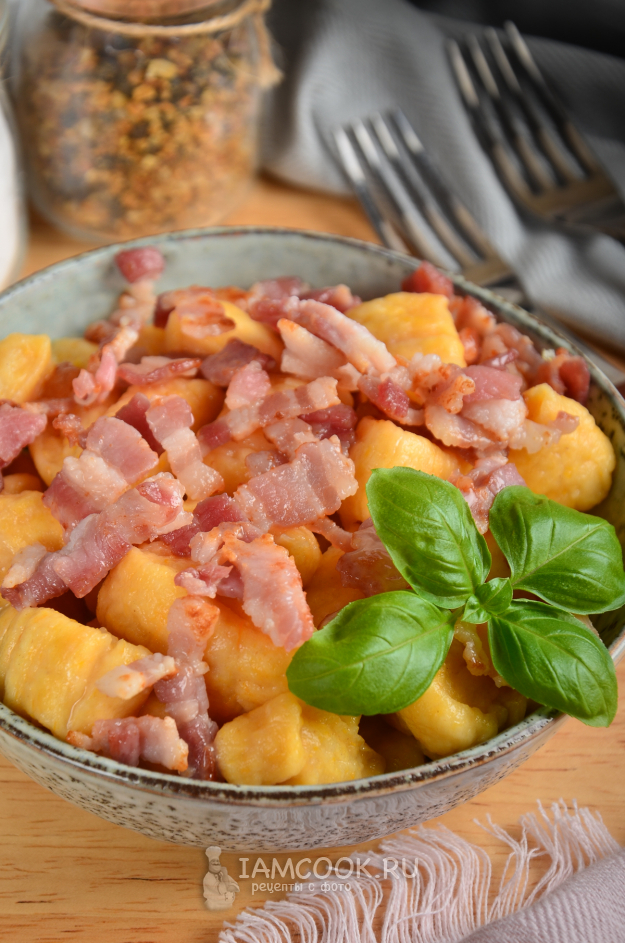 Перед подачей присыпьте тыквенные ньокки жареным беконом. Также можно добавить веточку свежего базилика.