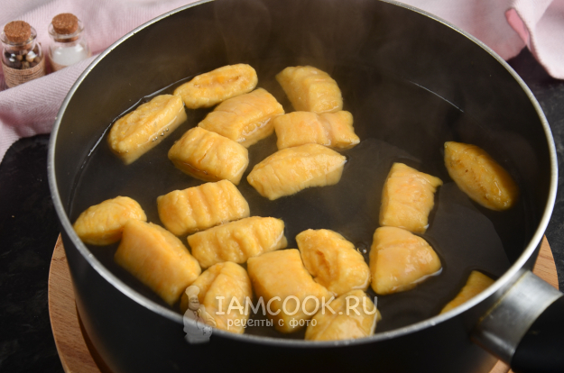 Проварите ньокки минуты 3-4 в слегка подсоленной воде, соберите шумовкой, когда поднимутся на поверхность.