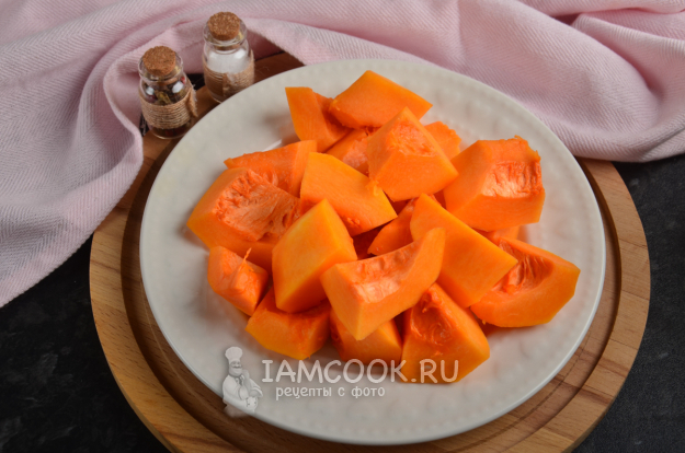 Тыкву очистите, удалите все лишнее и нарежьте мякоть на кусочки.