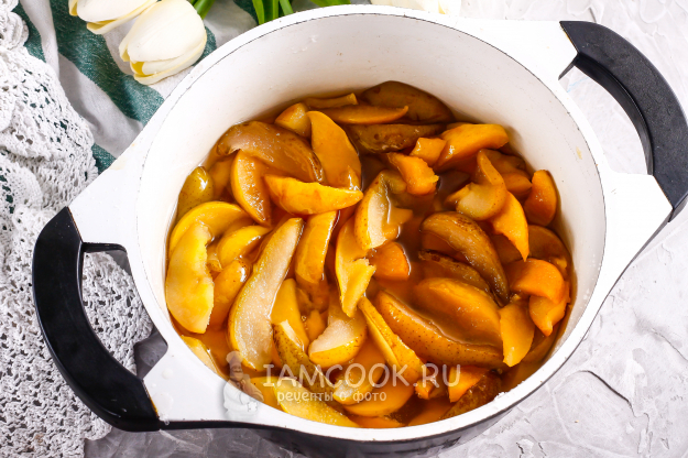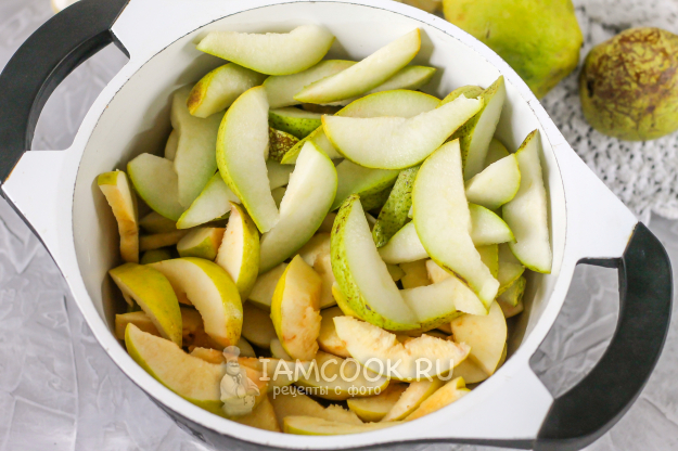Нарежьте четвертинки фруктов ломтиками в казан или кастрюлю с антипригарным дном, но не тонкими, чтобы они не поломались при перемешивании.