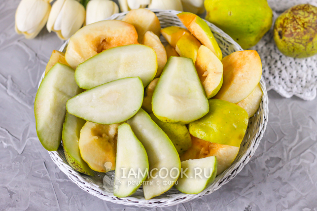 Тщательно промойте айву жесткой стороной губки, счищая ворсистый слой. Разрежьте каждый плод на четыре части и вырежьте семенные блоки. Айва часто бывает подпорченной червями, особенно если она желтая, спелая и ароматная. Поэтому такие подпорченные части мякоти тоже вырежьте, но старайтесь действовать быстро, чтобы мякоть не потемнела. Промойте груши и так же, как и айву, разрежьте на четыре части, удаляя семена. Промойте мякоть.