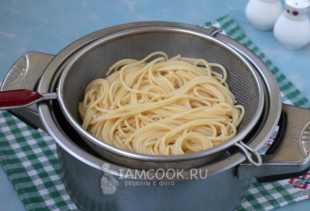 Параллельно на плите в кастрюле вскипятить воду, посолить и сварить макароны до готовности. Откинуть спагетти на сито, слив воду.