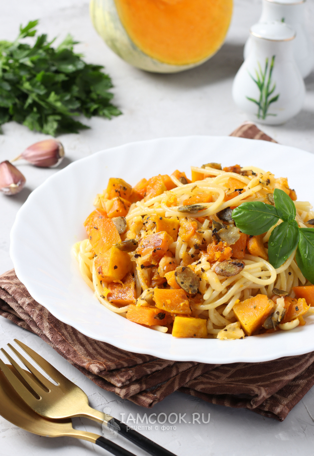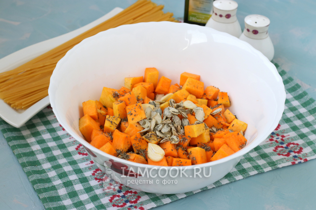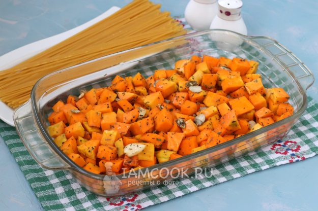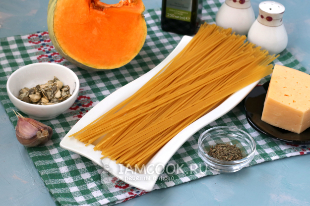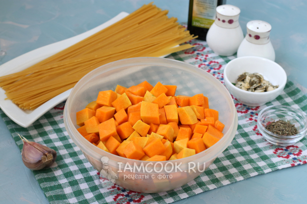 Для приготовления макарон с тыквой и сыром подготовить из списка необходимые ингредиенты.