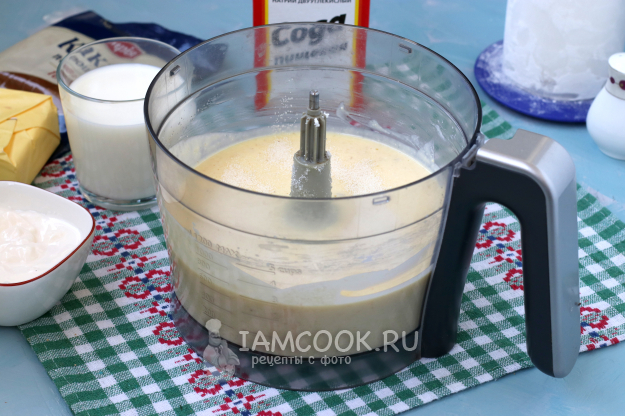 Затем добавить молоко, сметану и растопленное масло. Для удобства я в сотейнике растапливаю масло и добавляю к нему молоко и сметану, смешиваю, а затем эту массу добавляю в тесто.
