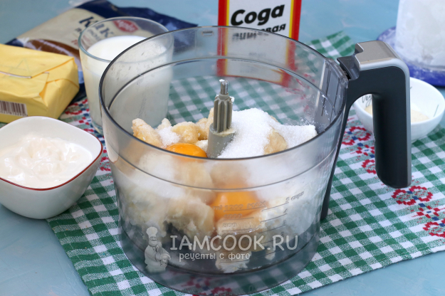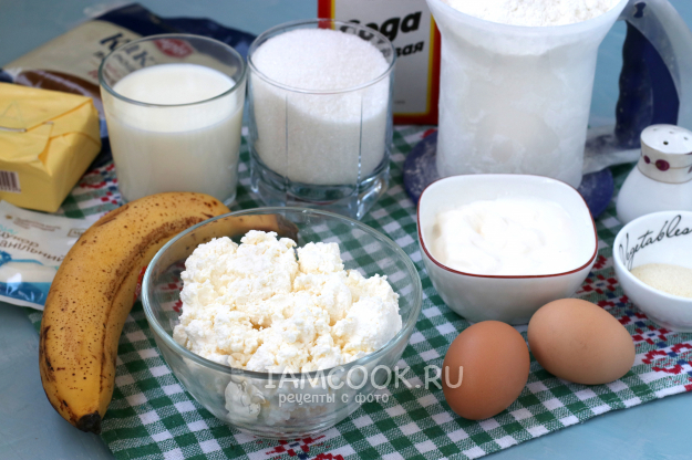 Начинать следует с начинки. В чашу блендера сложить творог, поломать на кусочки банан, добавить сахар и ванильный сахар, разбить яйца.