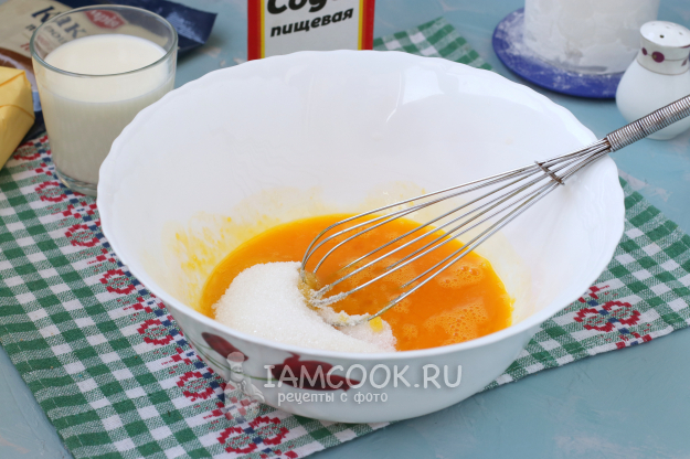 Для теста разбить в миску яйца, добавить соль и сахар, взбить венчиком.