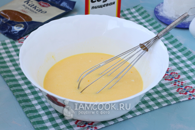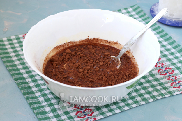 Далее добавить в тесто соду, которую нужно погасить уксусом или лимонным соком. Тщательно перемешать. Просеять в миску какао и размешать ложкой.