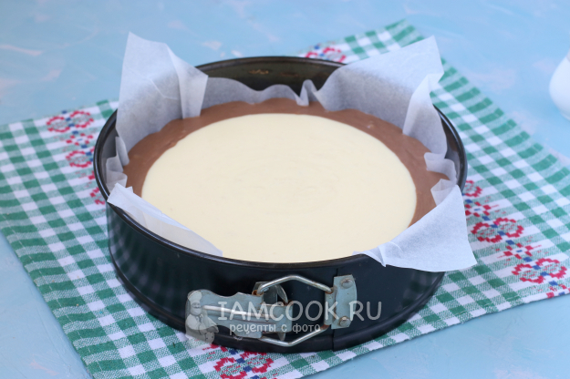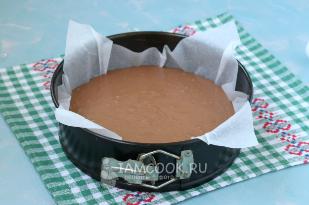 Частями добавить в тесто просеянную муку и окончательно перемешать тесто до однородной массы. Тесто будет жидким. Форму застелить пергаментом и вылить в неё тесто.