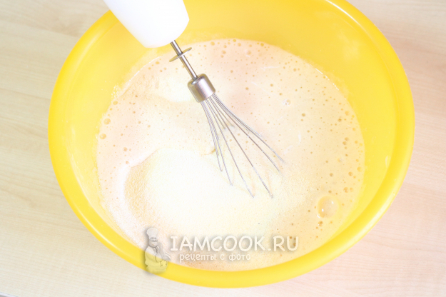 Вбиваем яйца, всыпаем щепотку соли, взбиваем миксером 3-5 минут - до пышности и образования пузырьков.