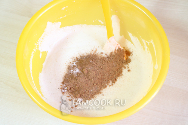 В набухшее тесто всыплем какао, корицу и соду. Тщательно перемешаем.