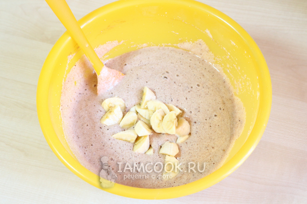 И добавим кусочки банана. И другие добавки, если таковые у вас имеются. Снова перемешаем и выложим в смазанную сливочным маслом форму.