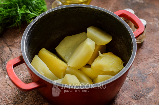 Картофель очистить и вымыть, просушить. Разрезать каждую картофелину пополам, после отварить картофель 10 минут в кипящей воде.