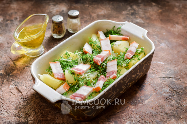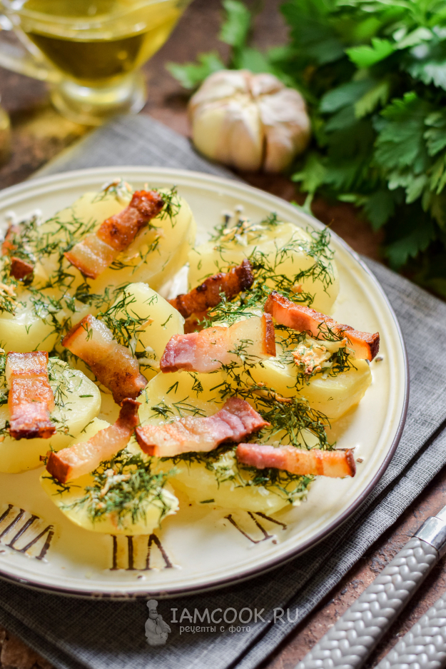 Поверх зелени разложить нарезанные кусочки сала. Запекать картошку 25 минут. После подавать аппетитный чесночный картофель к столу.
