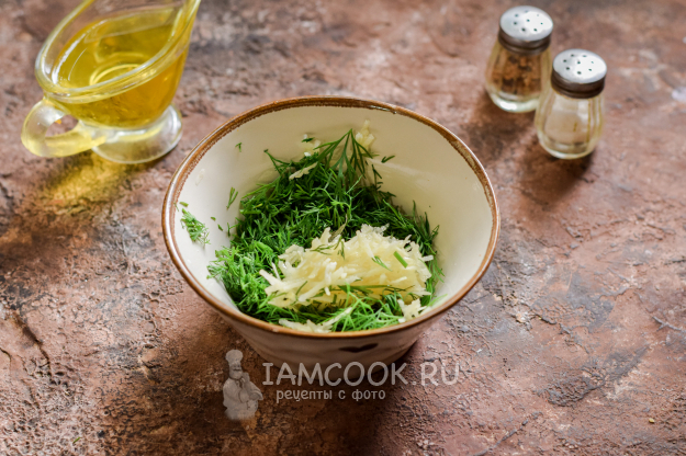 Укроп сполоснуть, нарезать как можно мельче и переложить в мисочку. Зубчики чеснока очистить и сполоснуть, натереть на мелкой терке и добавить к укропу. Перемешать.