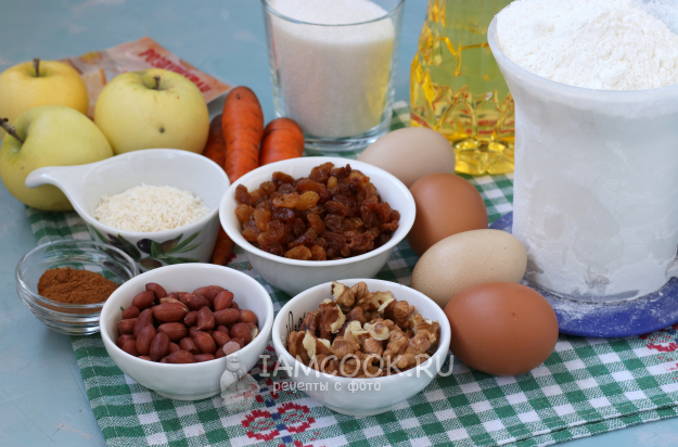 Для приготовления кекса с морковью и яблоком подготовить из списка необходимые ингредиенты.