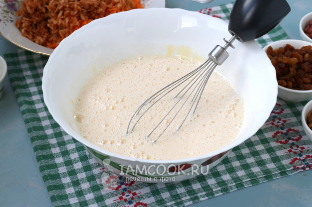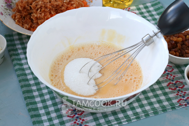 В отдельной миске взбить яйца венчиком, добавить сахар и взбить до пышной массы.