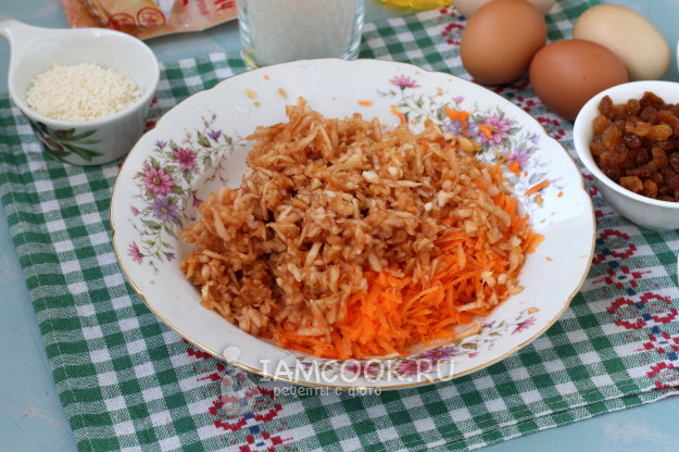 Почистить морковь и яблоки, натереть их на тёрке. Вес яблок и моркови я указала в очищенном виде.