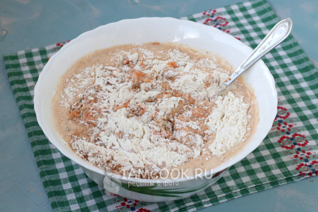 Добавить в миску тёртые яблоки с морковью, перемешать ложкой.