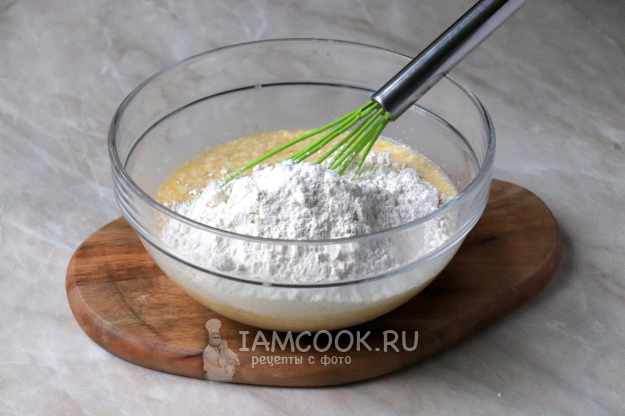 Тщательно размешать и ввести просеянную пшеничную муку. Учитывая, что мука у всех разная, добавлять её нужно небольшими порциями, каждый раз хорошо перемешивая и контролируя консистенцию теста.