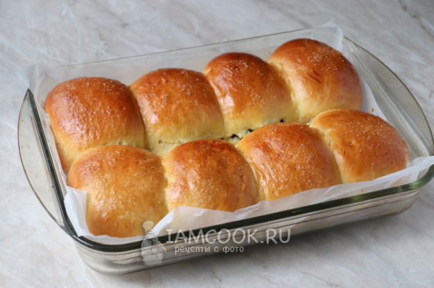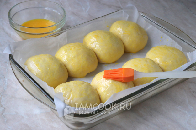 Затем поверхность булочек смазать взбитым яйцом и отправить в разогретую до 180 градусов духовку. По желанию булочки дополнительно можно посыпать сахаром, семенами кунжута или мака.