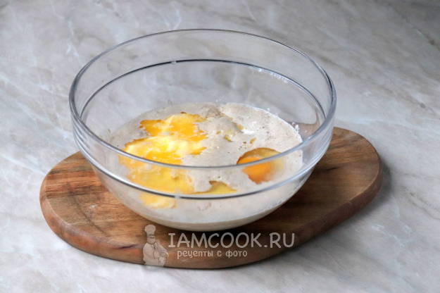 В готовую опару добавить оставшийся сахар (2 ст.л.), растительное и подготовленное сливочное масло, куриное яйцо и щепотку соли.