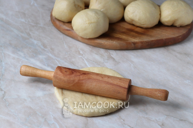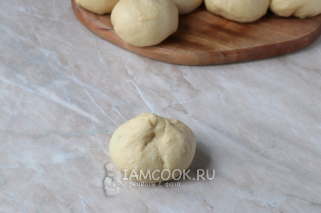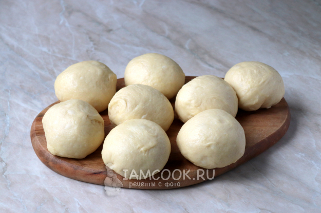 Подошедшее тесто обмять и разделить на 8 равных частей, примерно по 115 граммов каждая. Для точности можно воспользоваться кухонными весами.