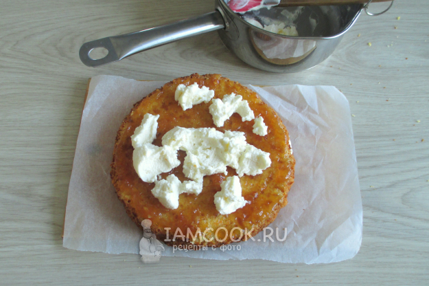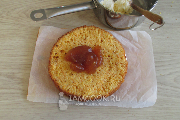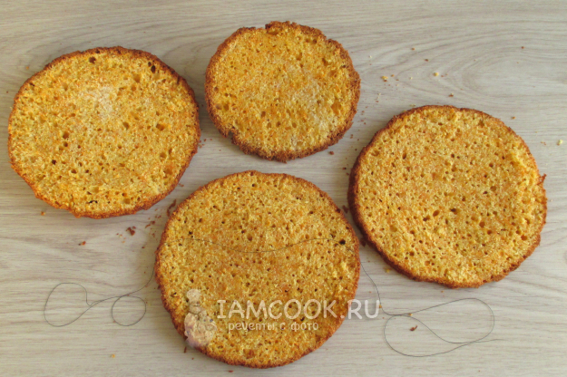 Для пропитки используйте либо готовый покупной апельсиновый сок, либо сами соедините свежевыжатый сок из половинки апельсина и добавьте сахар по вкусу. В подходящее блюдо наливайте примерно по трети пропитки и окунайте в неё каждый корж.