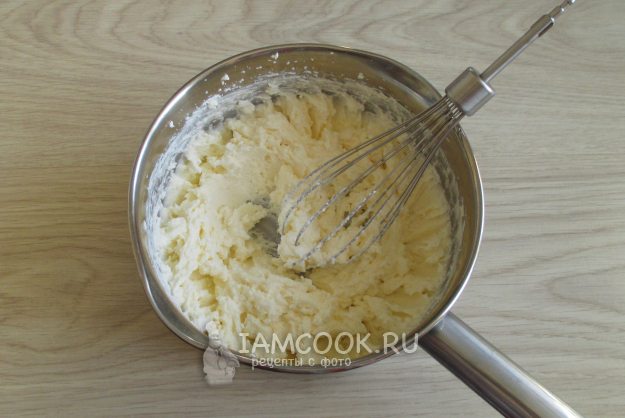 Для приготовления крема-чиз нужно сначала кусочки слегка размягченного при комнатной температуре сливочного масла взбить с сахарной пудрой и ванилином.