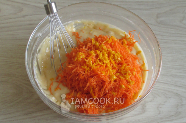 Морковь натрите вручную или измельчите в чаше блендера. Соскоблите с апельсина при помощи приспособления или просто мелкой теркой нужное количество цедры.