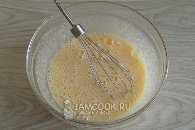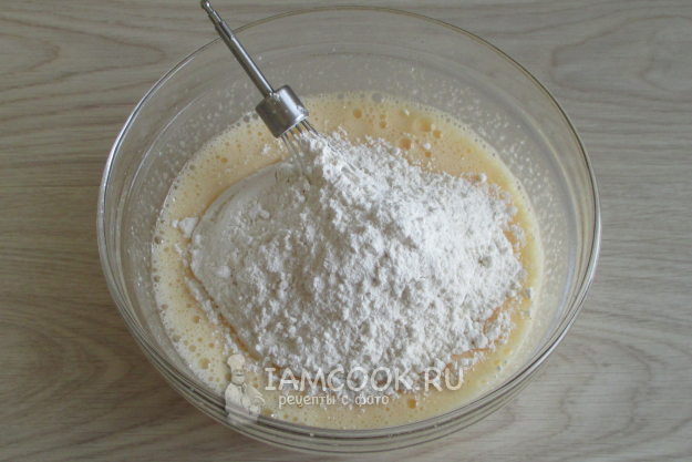 Соедините с мукой, перемешанной с разрыхлителем. Взбейте до состояния пышной однородной массы.