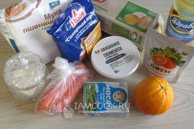 Для морковно-апельсинового торта с кремом чиз подготовьте ингредиенты по списку к рецепту.