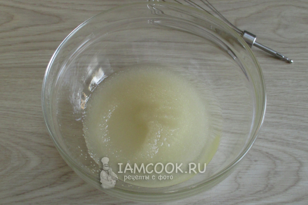 Для приготовления теста для основы перемешайте и взбейте растительное масло с сахаром. Растительное масло берите рафинированное подсолнечное без запаха.