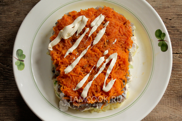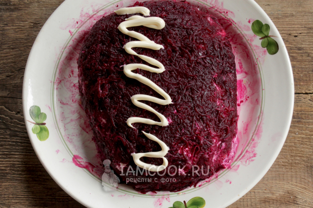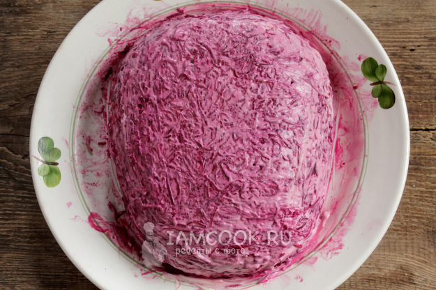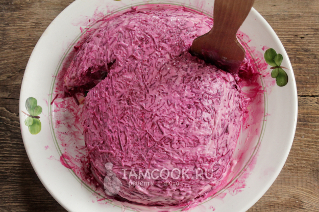 Верхушка салата - как обычно, свекольная. И снова добавьте майонез.