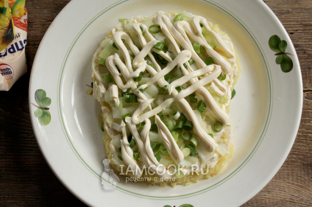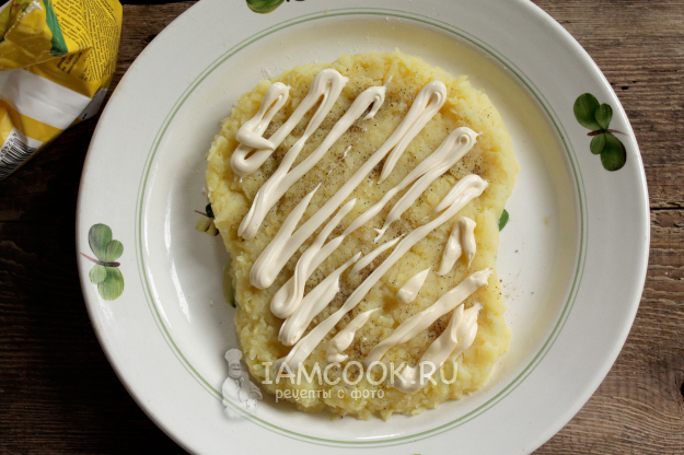 На плоской и просторной тарелке первой выложите картошку. Трамбуйте, солите и перчите по вкусу, нанесите майонез. Майонез размажьте лопаткой равномерно по всему периметру.