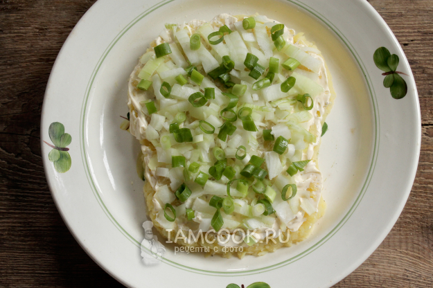Затем картофель покройте измельченным луком, репчатым и зеленым. Также равномерно, слой за слоем.