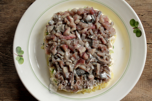 Следующим разложите филе селедки, нарезанное небольшими кубиками. Здесь прослойку майонеза можно пропустить, решайте самостоятельно.