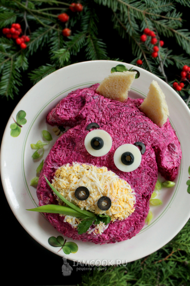 Добавьте «глаза» из яичных белков и маслин, «рога» — из хлебных ломтей, «ноздри» — из нарезанных кольцами маслин. В «пасть» вложите небольшой стожок, чтобы всем хлебосольного года:) Салат «Селедка под шубой» на новый год Быка готов. До подачи держите его на полке холодильника.