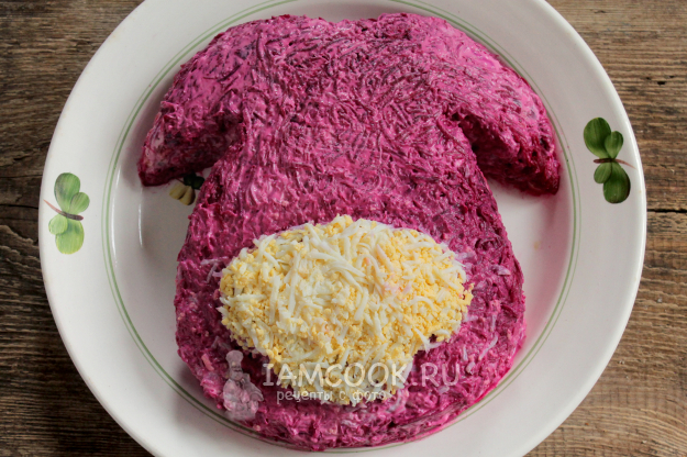 «Пройдитесь» лопаткой по всем граням/бокам, прикройте все разрывы свеклой с майонезом, из тертых яиц выложите «морду».
