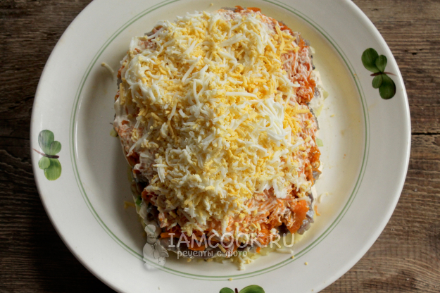 После моркови — тертые яйца, точно так же сплошным полотном. И немного майонеза.