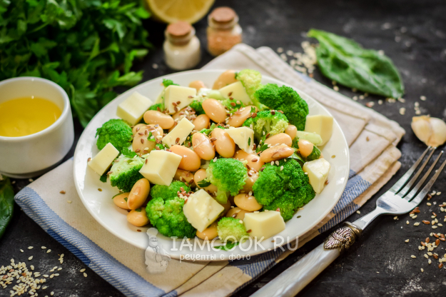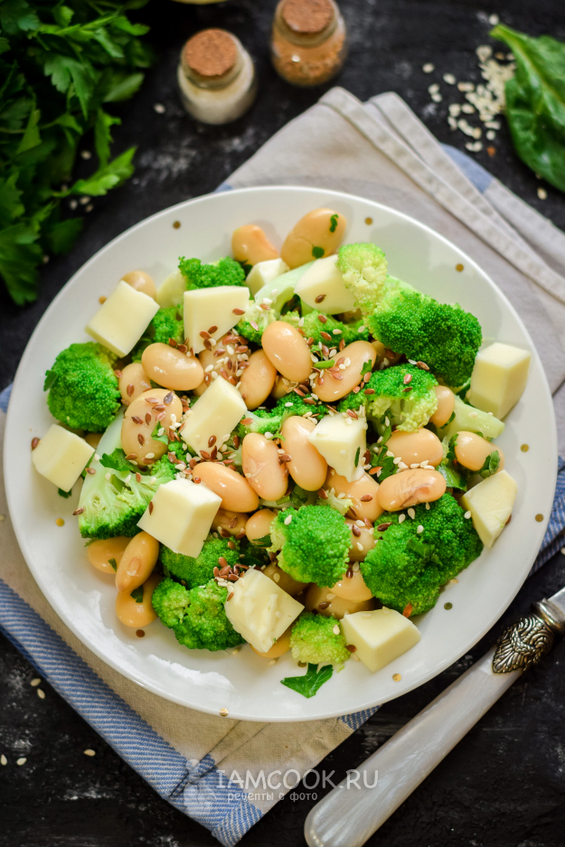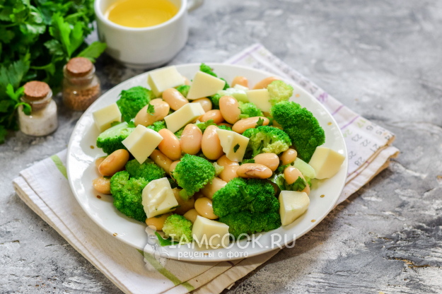 Перемешать ингредиенты и выложить салат на тарелку, добавить нарезанный кубиками сыр. Сбрызнуть салат маслом и лимонным соком. Вот и все, подавать аппетитный и вкусный салат из брокколи с фасолью к столу.