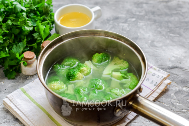 В небольшой кастрюле довести до кипения воду, переложить брокколи и варить 3 минуты. После воду слить, брокколи слегка остудить.
