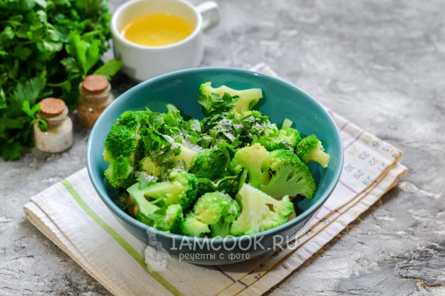 Сполоснуть и просушить брокколи. После нарезать соцветия небольшими кусочками.
