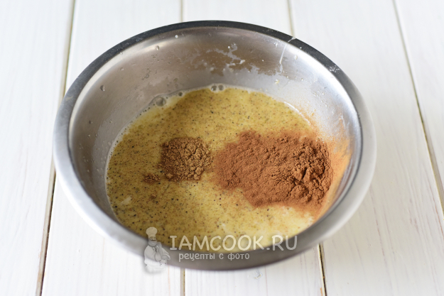 К смеси добавить корицу, мускатный орех, молотый кардамон, молотый имбирь. Перемешать.
