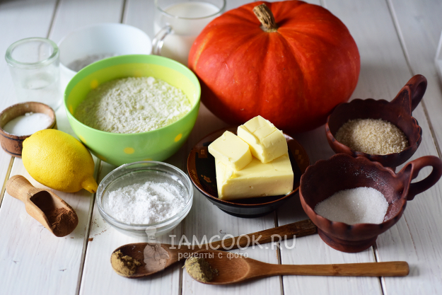Подготовить продукты для американского тыквенного пая. Масло и вода понадобятся ледяными, поэтому следует поставить их в соответствующих емкостях в морозильную камеру на 15 минут. Поверхность лимона и тыквы тщательно помыть в проточной воде.